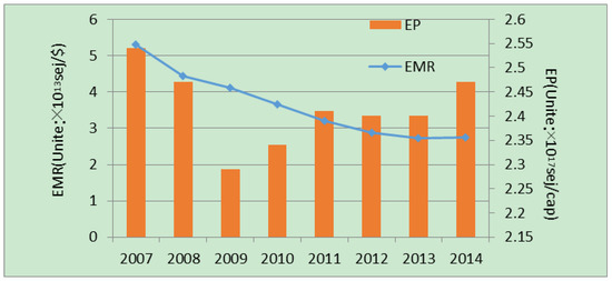 | Emergy money ratio (EMR) | sej/yuan | U/GDP | Emergy flux produced per unit of purchasing power |