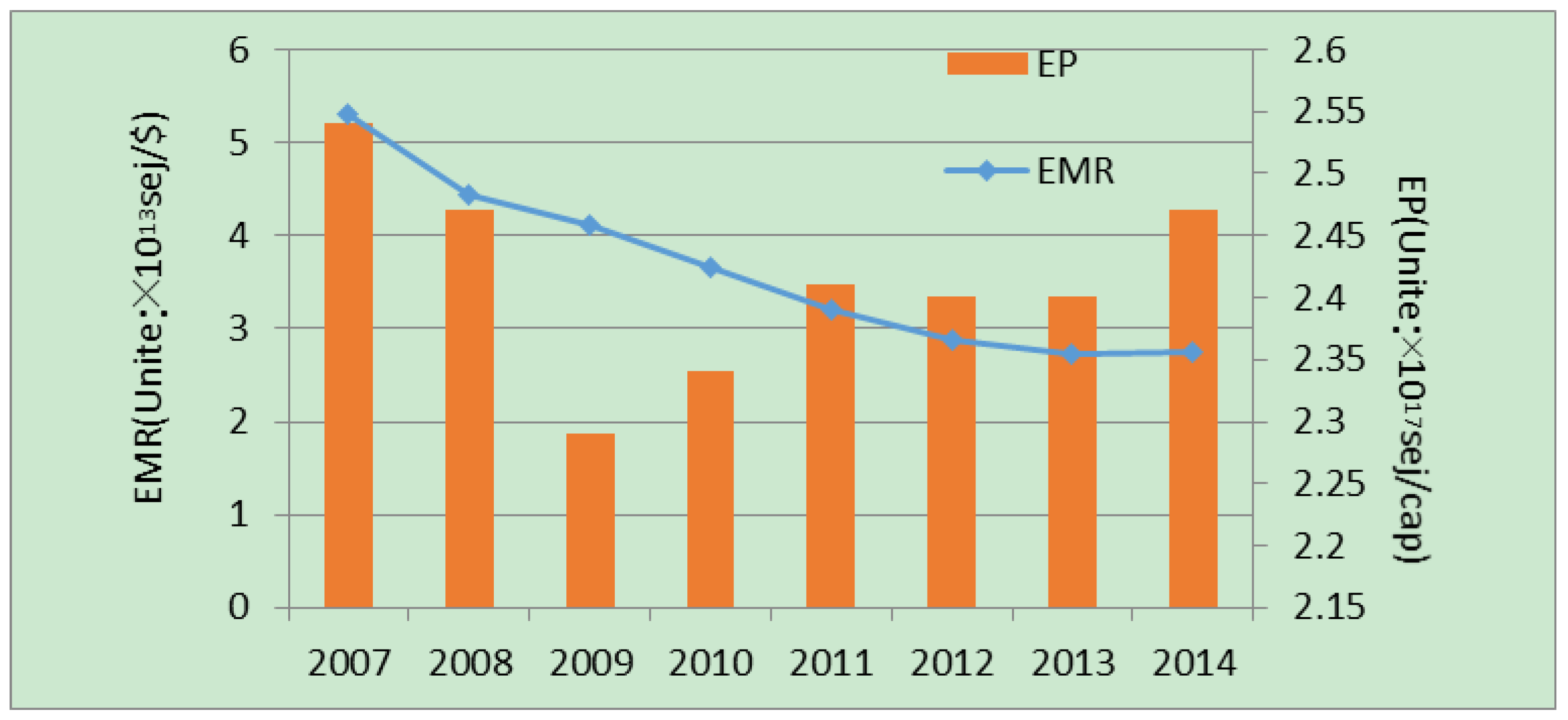 EMR is the ratio of total used emergy divided by the GDP of one region, which is an indicator to evaluate how the economic system depends on local resource consumption and money purchasing power. The higher the value of EMR, the fewer resources are being used to generate the same amount of GDP. Figure 3 shows that EMR in Taiyuan decreased by 48% from 5.31 × 1013sej/$ in 2007 to 2.74 × 1013 sej/$ in 2014; from the change process, the value of EMR is reduced, indicating that the increasing speed of consuming resources and energy was faster than the increase of GDP, and that Taiyuan’s money purchasing power declined.