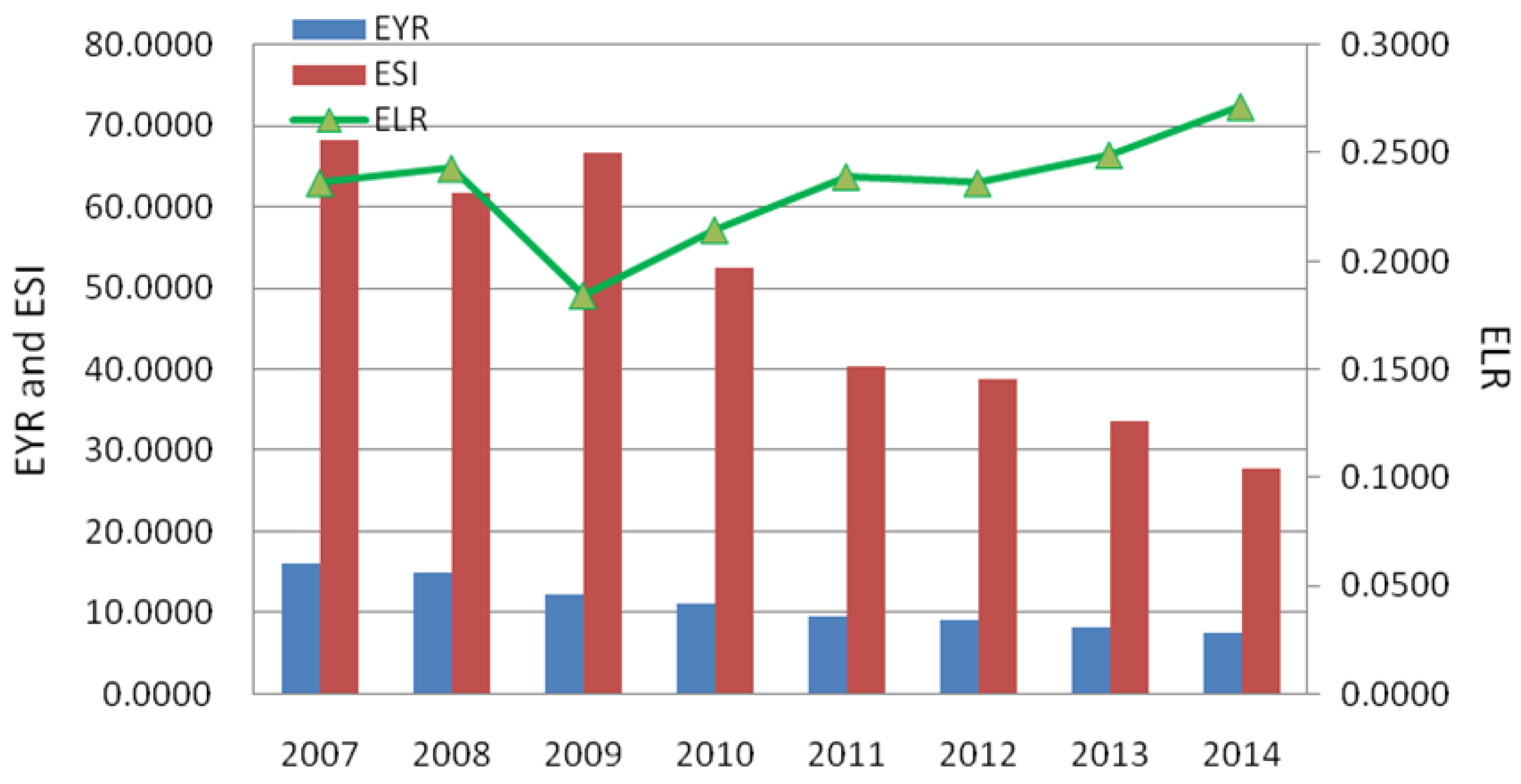 EYR can be used to measure the investment efficiency of external resources to exploit local resources and contributions to the economy. A larger EYR value indicates that the economic development relies more on local resources, so the higher the value of EYR, the more efficient the energy and materials used in the local urban system. As can be seen in Figure 4, the EYR of Taiyuan decreased gradually from 16.15 in 2007 to 7.56 in 2014, with an almost twofold decrease. This demonstrates that less local resources are exploited, and that the utilization efficiency of resources has been decreasing, and the configuration of resources in Taiyuan still need to be optimized. ELR reflects environmental pressure from the perspective of environmentally renewable capacity to support economic processes; the ELR in Taiyuan is on the rise with some fluctuations, increasing from 0.24 in 2007 to 0.27 in 2014. The above results demonstrate that the use of non-renewable resources were consumed, and there exists a great deal of potential opportunities for Taiyuan to adjust its industrial structure and to implement an energy saving strategy. ESI is the system performance indicator to measure one system’s overall sustainability. An increasing value of ESI indicates that one region is moving toward sustainable development, with a feature of using less nonrenewable resources locally available and less import, while a lower ESI value reflects that one region consumes more nonrenewable emergy and imports more emergy from outside, moving toward unsustainable development . In the study period, the ESI of Taiyuan shows a downward trend, declining from 68.33 in 2007 to 27.80 in 2014, which shows that the self-organization and sustainability of Taiyuan is continuously deteriorating. This result reveals that Taiyuan, a resource-dependent city, explored and produced large quantities of mineral resources, which puts more stress on the environment as a consequence, and that this is not sustainable in the long run. As the capital of Shanxi Province, though tremendous volumes of mineral resources were buried underground the city, its exploration activities were constrained by some influential factors, such as urban land use planning and environmental regulations, etc. But the stress to the environment is still high; it is critical to identify the optimal pathway so that the resource-dependent city can move toward sustainable development.
