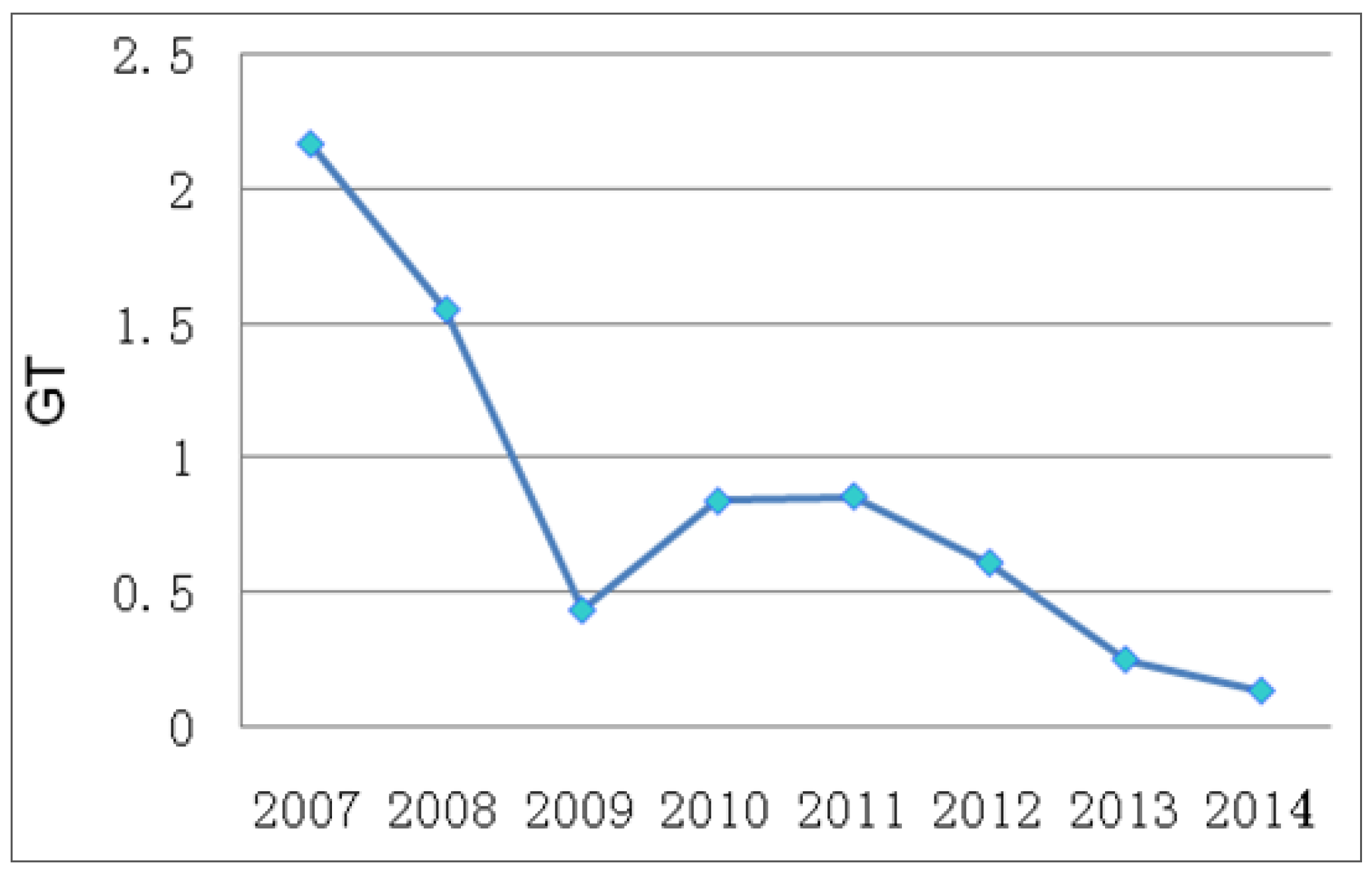 As shown in Figure 5, from 2009 to 2014, the values of GT fluctuate in a relatively stable condition, while some unstable values appear from 2007 to 2009. As a whole, the results mean that the impact of economic development on environment tend to decrease over time, and economic development is harmonious with environmental protection. The GT values reached the relatively stable period maximum of 0.86 in 2011 and then declined gradually from 2011 to 2014. Because of the international financial crisis starting in 2008, Taiyuan expanded investment of infrastructure once again in order to ensure its rapid economic growth, in which the effects of investment of infrastructure to the environment are evident and the value of GT decrease disharmony.