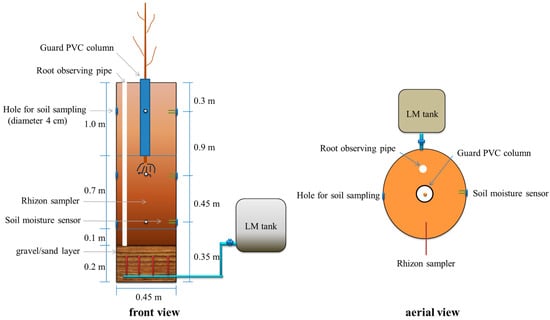 The pilot-scale column experiments were conducted under natural conditions during 21 months (from April 2013 to December 2014). The pilot-scale columns were fabricated from PVC (50 cm inner diameter and 200 cm height) and they were filled from bottom to top with 0.2 m of gravel and 1.7 m of prepared soil. In order to investigate the change in N and P contents in soils by woody plants, two soil sampling holes (4 cm inner diameter) on the side at 1 m and 1.5 m from the top of the column were set. An endoscope equipped with camera was also used at 1.5 m depth to observe the growth of the woody plant roots. Both poplar and willow were transplanted at 1 m depth in soils with PVC guard column (Figure 2) and also poplar was transplanted into the surface layer (Figure 2). After transplanting, water was supplied through the bottom of each column for rootage until July and then prepared LM (70 L; N: 110 mg·L−1; P: 110 mg·L−1) was supplied respectively from August to September in 2013 and from April to May in 2014 through the column bottom, using a water tank. Soil samples were collected from each sampling hole each year in April and September and in November 2014 and assessed for the effect of deep-planting technique on the removal of N and P in LM-applied soils. After cultivation, each column was split in half and then the root growth was investigated.