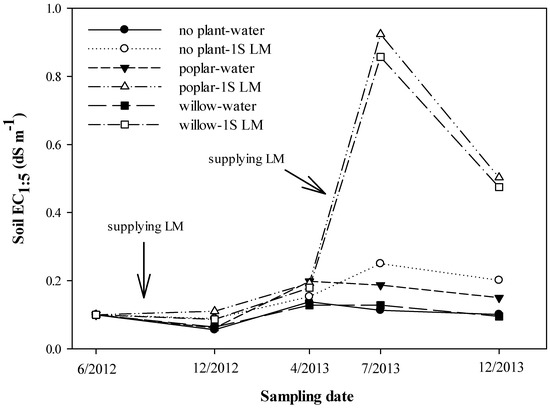 Since soil EC is one of the most useful and easily obtained properties of soil that influences plant productivity [21], it can be used to indirectly estimate the amount of inorganic ions such as N and P available for plant uptake. Soil EC values are presented Figure 3. Before the experiment, the collected soil EC value was 0.1 dS·m−1 and there was not much change in soil EC observed when tap water was applied with/without plant cultivation for two years. Also, EC values of the soil after adding 1S LM without plant cultivation, were maintained in the range of 0.09 to 0.25 dS·m−1 for two years. Water transfer from the soil-plant system to the atmosphere occurs through evapotranspiration, which includes evaporation of water from the soil and transpiration through plant stomata. Therefore, even though 1S LM was supplied to the pot soil from the bottom, the EC of control (no woody plant cultivation) soil was not influenced by 1S LM because less evapotranspiration is associated with the lack of moisture rising from bottom to top. However, though EC values of soils after LM application were not measured during the cultivation period in 2012, EC values of the soils after adding 1S LM with both poplar and willow cultivation dramatically increased by 379% from April to July 2013. This was attributed to the enhanced evapotranspiration of water from applied LM caused by cultivation due to the major growing season for trees in Korea (from late spring to early autumn—late March to early September). Subsequently, soil EC values decreased back to original condition from July to December 2013 due to the uptake of inorganic ions by plants.