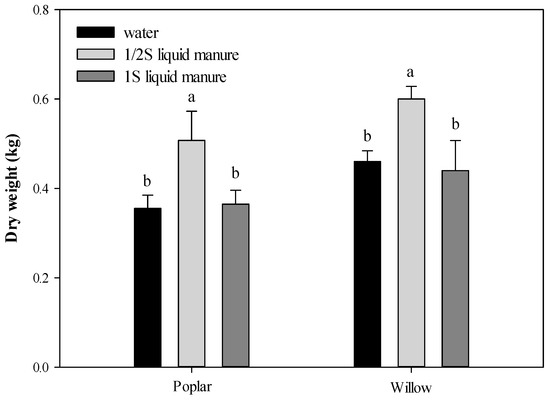Even though there were no significant differences in biomass yield of both woody plants between 1S LM application and tap water application, as expected from the observed increase in soil ∆N and ∆P concentrations following woody plants cultivation, the concentration of N and P in the leaves of both the woody plants increased with elevated LM application rate (Figure 5). The concentrations of N and P in the leaves of poplar cultivated in the soil receiving 1S LM were 49 g·kg−1 and 2.0 g·kg−1 respectively, compared to 8 g·kg−1 and 1.2 g·kg−1 respectively when grown in the soil receiving tap water. Also N and P contents in the willow leaves cultivated in 1S LM-applied soil were 43 g·kg−1 and 2.3 g·kg−1 respectively which was four and two times higher respectively than that in the willow leaves from the tap water-applied soil (N: 11 g·kg−1; P: 1.5 g·kg−1). As a result, these results clearly demonstrate that both poplar and willow had a sufficient nutrients removal efficiency and did aid in the remediation of N and P contaminated soil. In other words, these woody plants could promote the removal of N and P originating from the carcass burial sites during growth.
