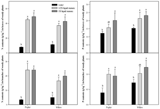 N and P contents in the woody plants cultivated in pots. Columns assigned with different letters indicate significant differences (p < 0.05) amongst the treatments.