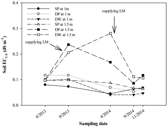 Changes in EC1:5 in soils at 1 m and 1.5 m depth (SP: surface planted poplar; DP: deep-planted poplar; DW: deep-planted willow, supplying LM means the event of application of liquid manure).