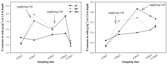 Changes in N and P contents in soil at 1.5 m depth (SP: surface planted poplar; DP: deep-planted poplar; DW: deep-planted willow, supplying LM means the event of application of liquid manure).