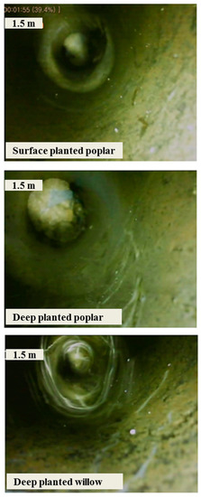 As described above, deep-planted poplar and willow transferred the contaminant from deep soil layer to their rhizosphere. This was due to the fact that both poplar and willow had long stems and consequently, they can survive and take up N and P from more depth in the contaminated soils even though they were buried deeply (up to stem height). Indeed, an increased number of root hairs of deep-planted poplar and willow were observed by endoscopy at 1.5 m depth in October 2013, which was not the case for surface planted poplar (Figure 8). Furthermore, results of observation of root growth after cultivation showed that the deep-planted woody plant roots reached a depth of two meters, which corresponds with the depth of carcass burial sites in Korea. While the surface planted woody plant roots reached only a depth of 1 m (Figure 9). Thus, these results demonstrated that the deep-planted poplar and willow roots could more readily access the deeper contaminated plume and enable more efficient uptake of the amount of contaminants from deep soil layers.