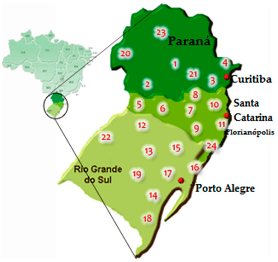 Map of Brazil with the geographical reach of Rede Ecovida and its regional centres. Source: [14].