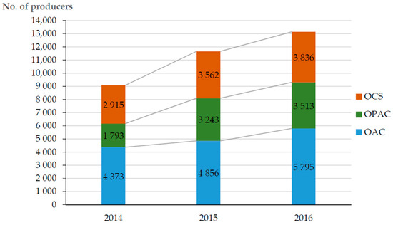 Number of organic producers in Brazil according to the organic accreditation system. OAC: Third-party certification; OPAC: Participatory Guarantee Systems; OCS: Social Control Organizations. Source: Brazilian National Register of Organic Producers [30].