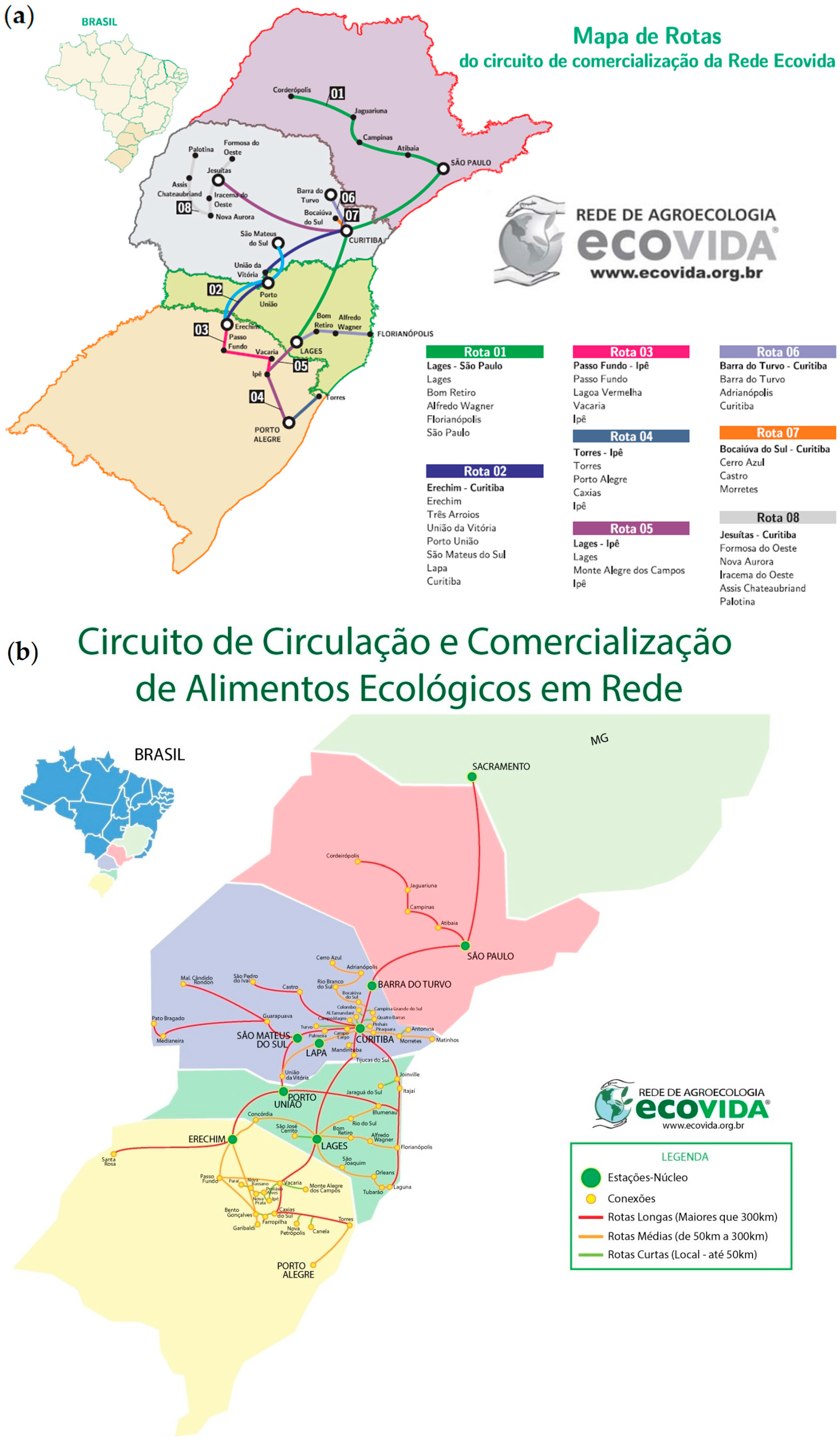 Route map of Ecovida Network’s Trade Circuit in 2008 (a) and 2016 (b). Source: [15,16,17,18,19].