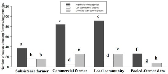 The prevalence of high-, low- and moderate-scale conflict species and type of farmer or community affected from 1994 to 2015. Bars denote total number of human–wildlife conflict cases generated during the meta-analysis. Different letters above bars (representing the p-values of the linear mixed models generated in Table 1 and Table 2) denote significant differences between different types of people affected by high-, low- and moderate-scale conflict species.