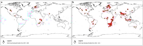 Comparison of the number of scientific publications concerning human–wildlife conflict in the published literature between (a) 1994–2000; and (b) 2001–2015. Red circles are global positioning system data points that represent human–wildlife conflict study sites, showing a substantial increase in publications of human–wildlife conflict in Africa and Asia over the two time periods and in previously under-reported South America.