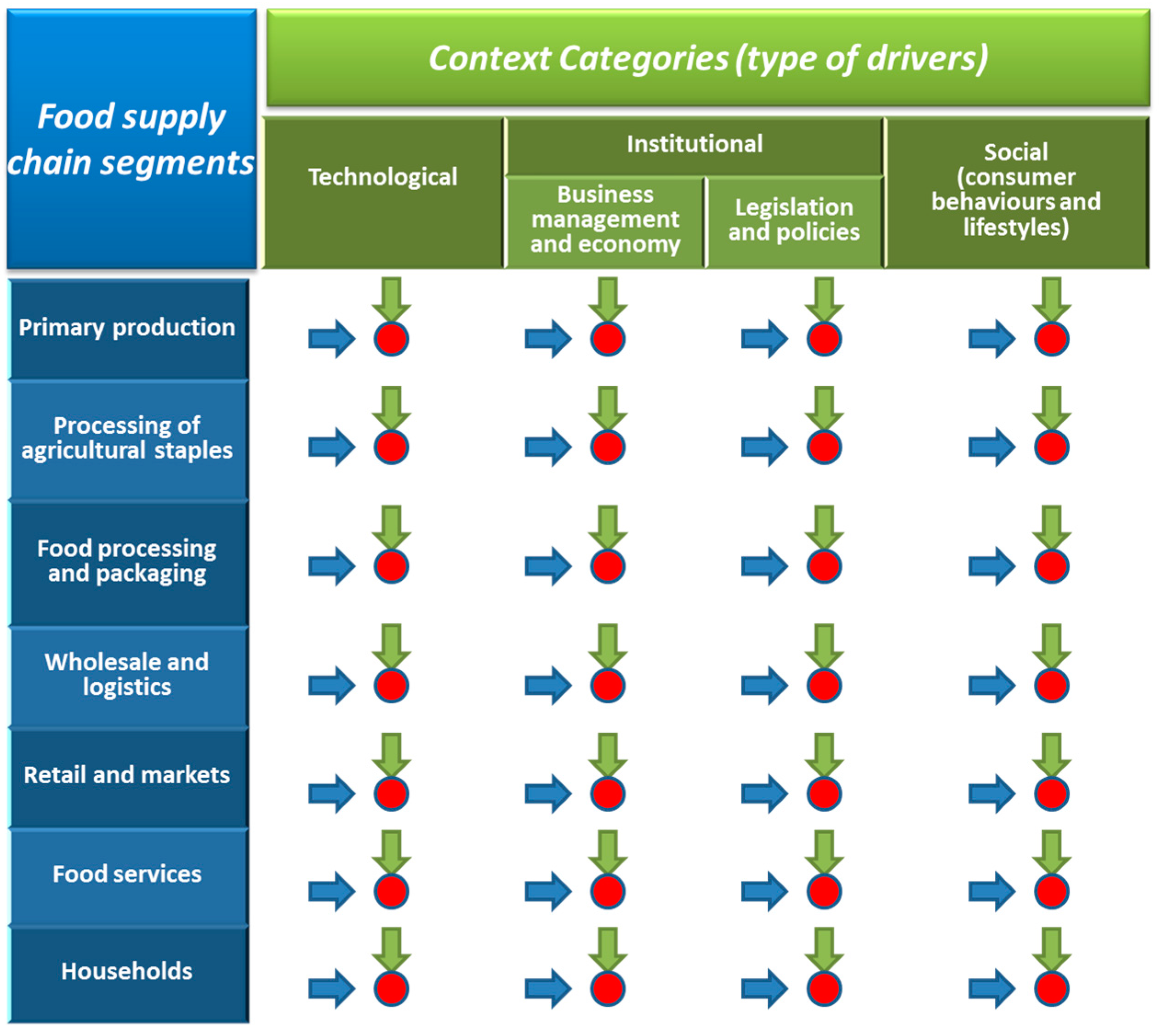 Representation of the matrix structure of the analysis: the small red disks, the blue arrows, and the green arrows respectively symbolise the information collected, the horizontal analysis by FSC segment, and the vertical analysis by context category (own elaboration).