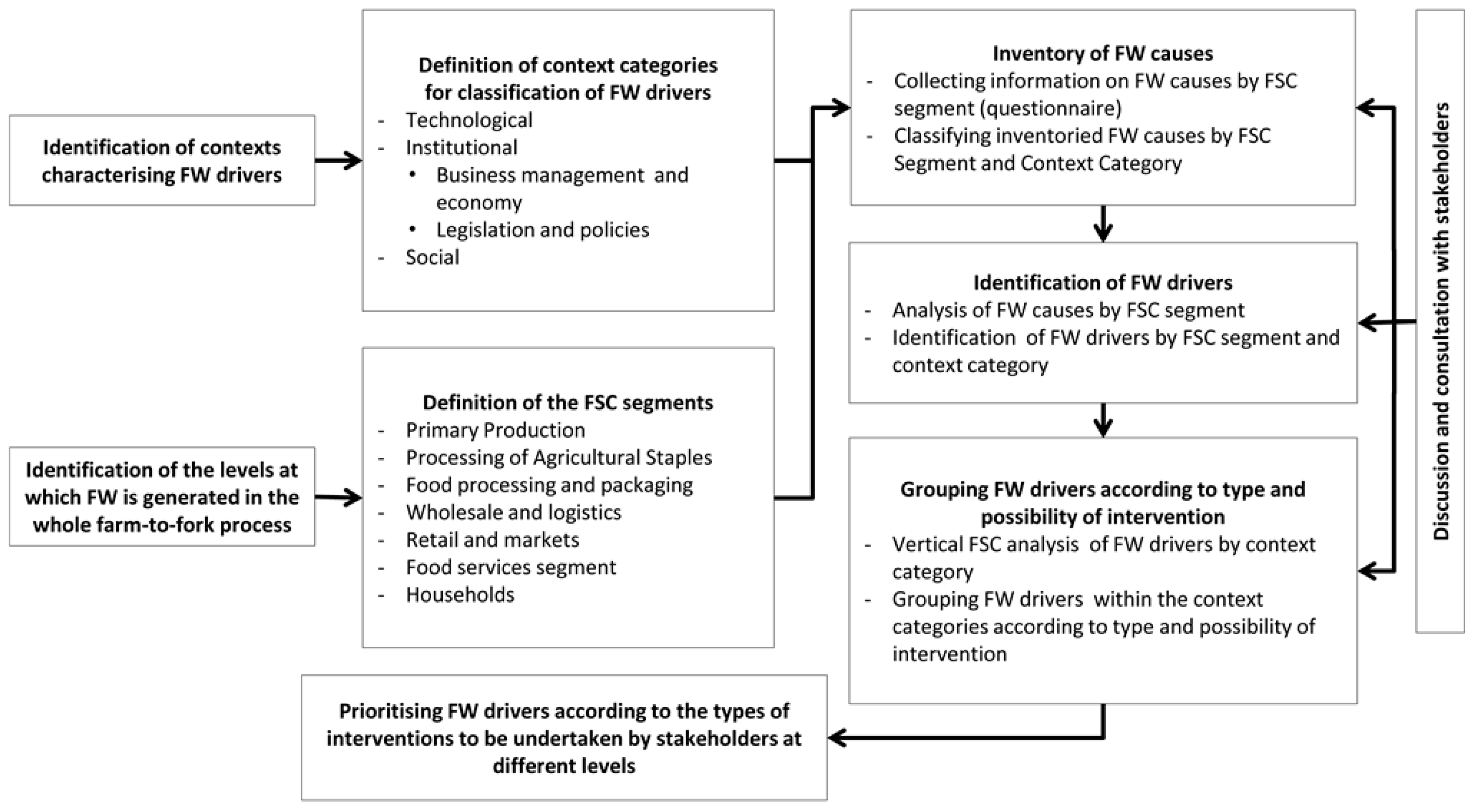 After the inventory, the identified FW causes were analysed to define the respective originating drivers and classify them into the three contexts. The whole supply chain was then analysed vertically under the perspective of the drivers’ categories, as set by the matrix structure of the study (Figure 1). This exercise, which also took into consideration the focus groups’ consultations, led to distinguish, within each context category, three groups of drivers. The clustering criteria were specific for each context, but followed the general principle of differentiating the drivers by possible interventions for FW reduction (Table 2).