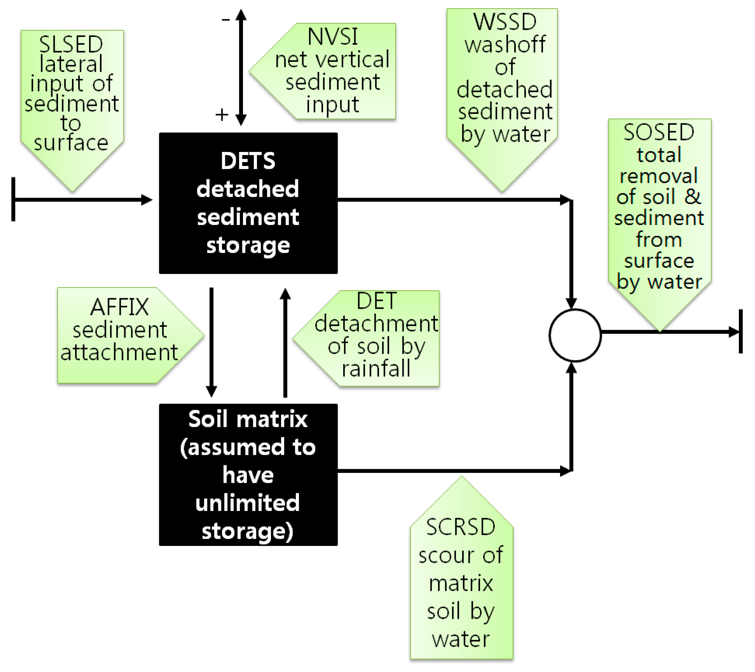 HSPF was developed based on the Stanford Watershed Model IV, which was developed to simulate the portion (the land phase) of the hydrologic cycle for an entire watershed [18]. HSPF is now available from the U.S. Environmental Protection Agency (U.S. EPA). The HSPF model can simulate the hydrologic and water quality processes on pervious and impervious land, and the hydraulic and water quality in a water body [18]. The simulation modules in HSPF used for pervious and impervious land and reach are PERLND, IMPLND, and RCHES, respectively. The fluxes and storages of sediment used to simulate PERLND are shown in Figure 1.