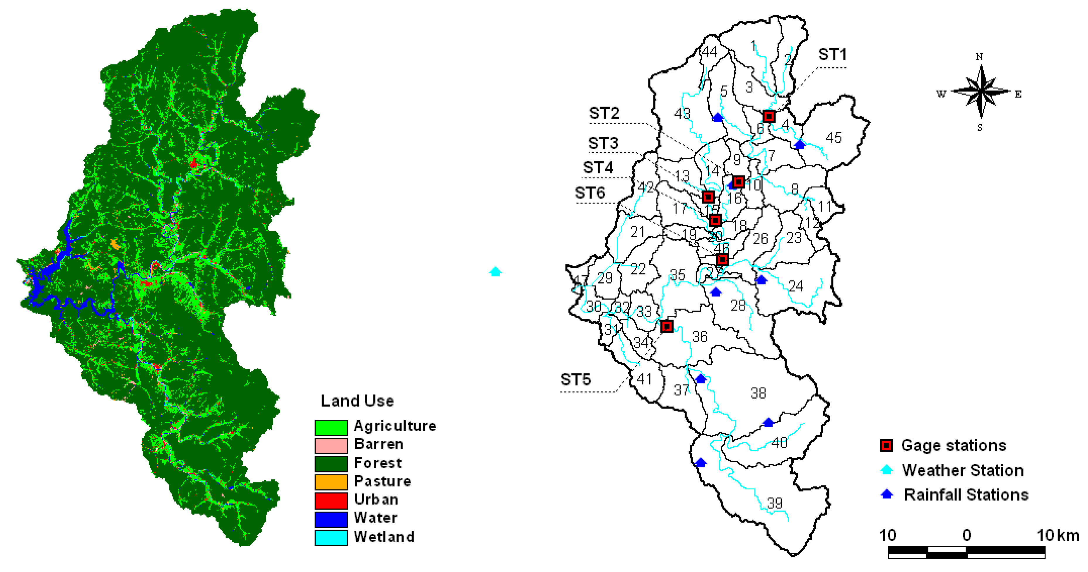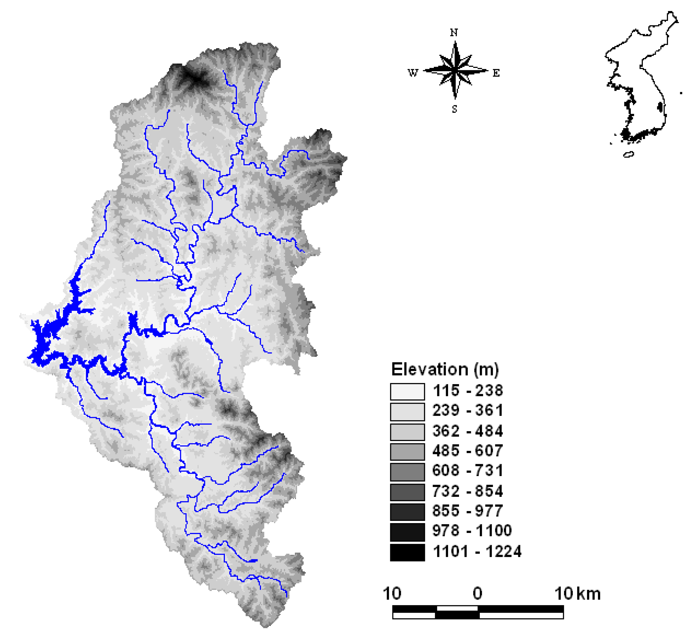 The user control input (UCI) file of HSPF was generated by the Better Assessment Science Integrating point and Non-point Sources (BASINS), which is a multipurpose environmental analysis system. BASINS requires some geographic information system (GIS) data, including Digital Elevation Model (DEM), land-use, watershed, and river data. The DEM, with a mesh size of 30 m (Figure 2), and the land-use coverage (Figure 3) were obtained from the Korean Ministry of Environment, and the other GIS data, such as watershed and river data, and the location of weather stations were obtained from the Korean Ministry of Land, Infrastructure and Transport. The 47 subwatersheds were delineated using the subwatershed delineation tool of BASINS with DEM (Figure 3). Hourly weather data including temperature, cloud cover, wind speed, solar radiation, and dew point temperature were obtained from the Korea Meteorological Administration, and hourly rainfall data at eight rain gage stations within the Lake Imha watershed were obtained from the Korean Water Resources Corporation (K-Water). Suspended sediment concentration and water flow rate were monitored at every 4–15 h for rainy days during 2009–2010. Some monitoring chances for peak flow were missed due to the hazardous weather conditions including wind, lightning, flooding. Land use classification covered the monitored stations, and a summary of the rainfall events used for calibration is shown in Table 1 and Table 2, respectively. Amount of rainfall ranged from 28.0 to 68.9 mm and, duration and maximum rainfall intensity were 4–44 h and 6.0–24.0 mm/h, respectively.