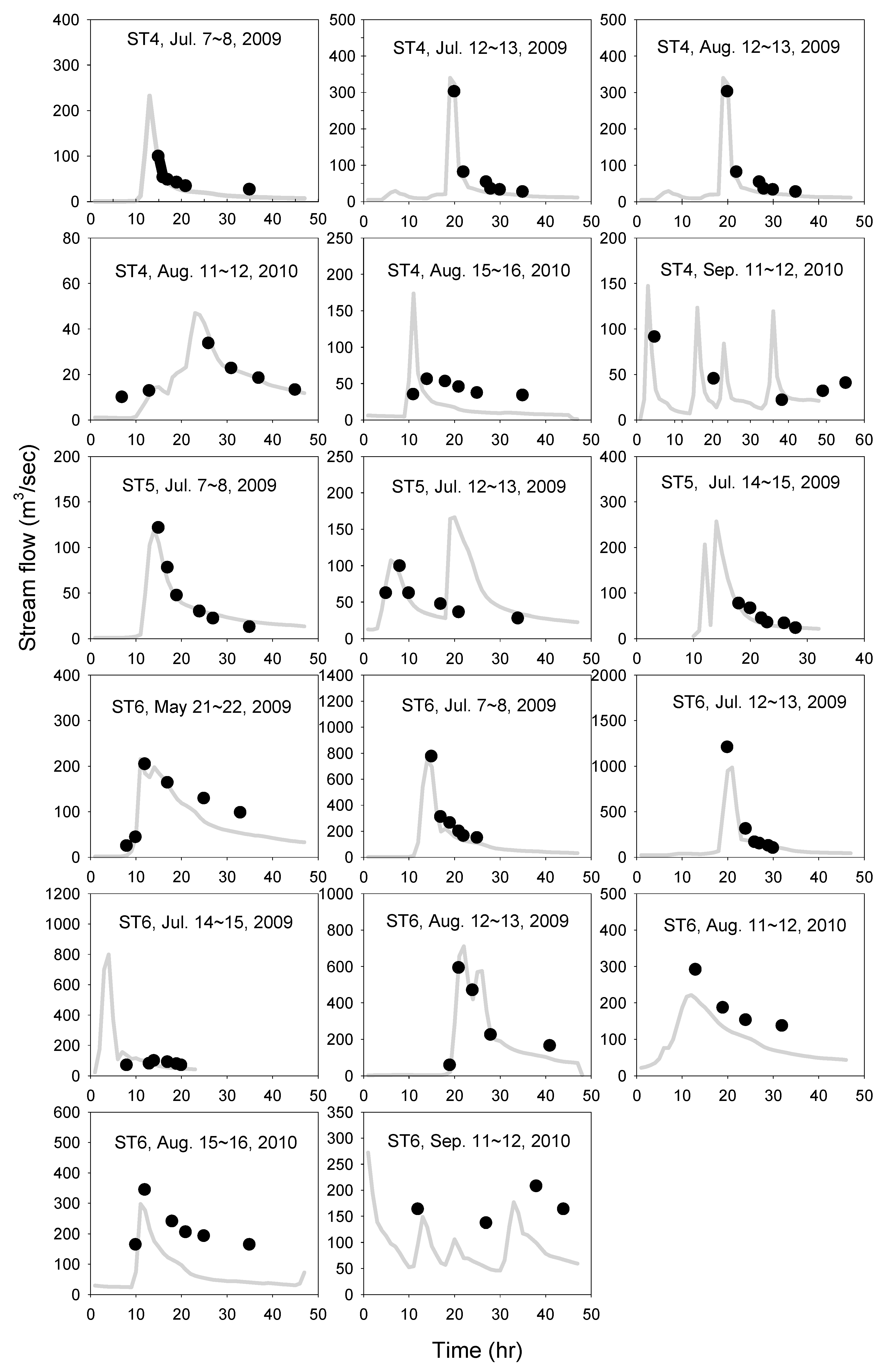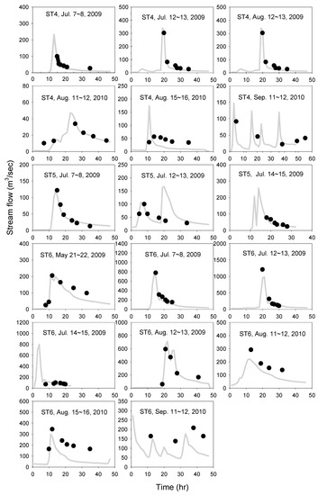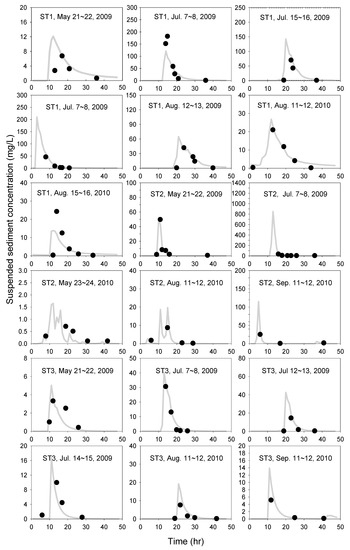 Another characteristic of sediment loads under the East Asian monsoon climate is that a significant amount of sediment was loaded during one event (Table 8). Heo et al. [30] reported that 22%–33% of total suspended sediments are loaded by typhoon under an Asian summer monsoon climate. Based on the average value during 2001–2010, over half of the yearly suspended sediment was loaded during one event ranging from 26% to 94% for ST5 and from 29% to 90% for ST6. More than 90% of yearly suspended sediment was loaded by one event at ST5 in 2008 and at ST6 for 2006.