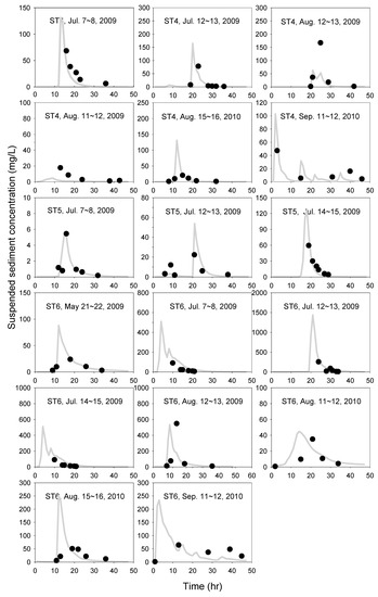 One of the characteristics of the East Asian monsoon climate is extreme precipitation or annual variabilities [29]. Annual variability of precipitation could influence the annual suspended sediment loads because suspended sediment load is highly dependent on rainfall intensity. There was significant variance in the yearly suspended sediment loads in ST5 and ST6 as shown in Figure 8 and Table 7. Yearly suspended sediment loads ranged from 6873 to 73,955 ton/year from ST5 and from 6454 to 60,787 ton/year from ST6, and the standard deviation of yearly sediment loads was 19,869 ton/year for ST5 and 15,527 ton/year for ST6 (Table 7). The maximum yearly suspended sediment loads were around 10 times higher than the minimum value during 2001–2010 in ST5 and ST6 (Table 7).