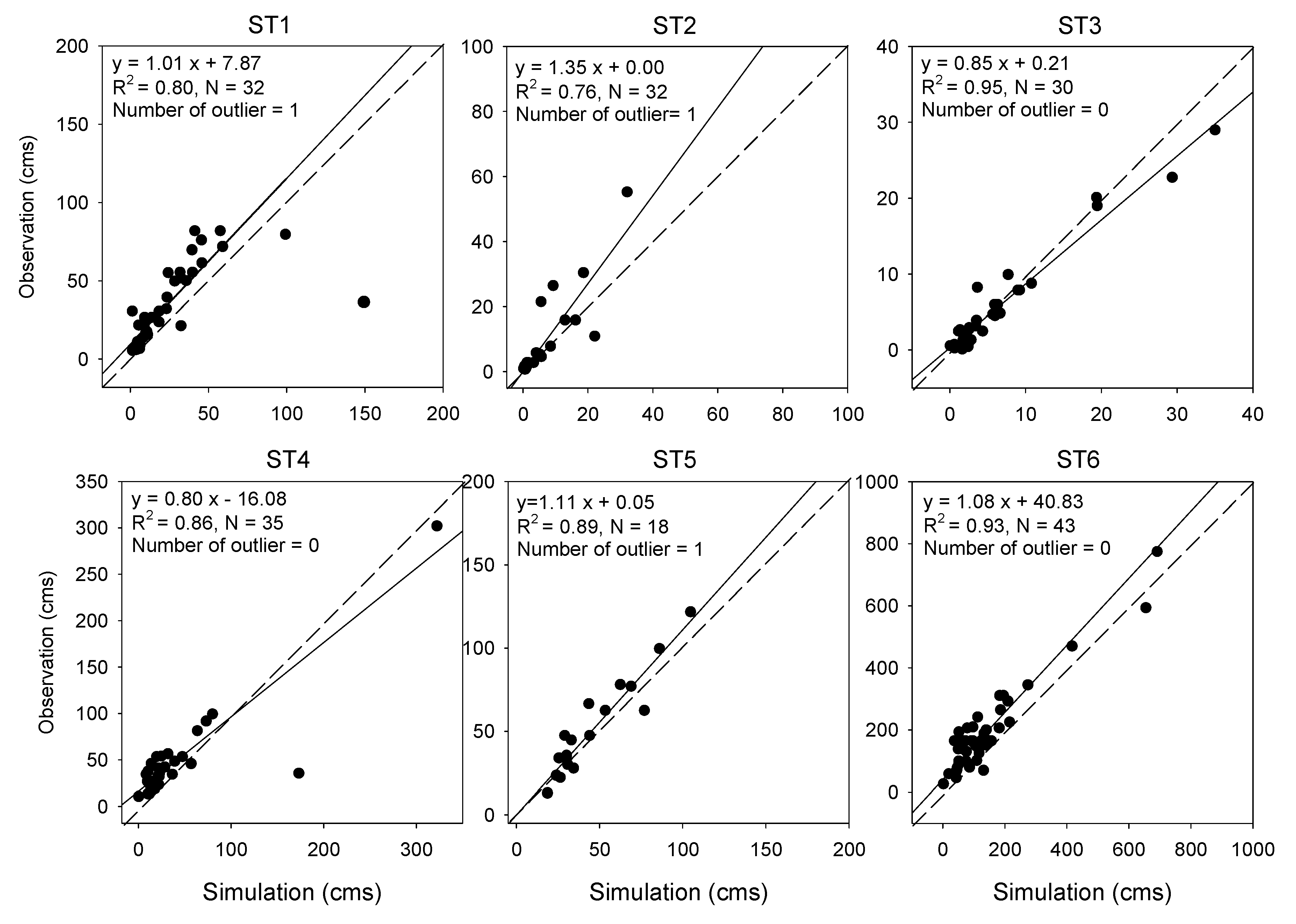 The calibration results of HSPF are shown in Table 5, Figure 4 for hourly stream flow, and Figure 5 for hourly suspended sediment yield. The 1:1 scatter plot and regression analysis between the observed and simulated values are shown in Figure 6 and Figure 7. One or two extra-ordinary data points which contribute to lower NS or relative error were excluded. The coefficients of determination and NS for stream flow ranged from 0.76 to 0.95 and from 0.78 to 0.96, respectively. The coefficient of determination and relative error for suspended sediment yield calibration ranged from 0.62 to 0.96, and from −1% to 23%, respectively. Although some simulation results underestimated peak points, overall, the performance of the HSPF calibration of the stream flow and suspended sediment yield was “good”, based on the HSPF calibration tolerance (Table 4). The ranges of calibrated HSPF parameters by six subwatersheds related to water budget and sediment simulation are shown in Table 6. All of the calibrated parameters for simulating the water budget were within the “possible” range suggested by U.S. EPA.