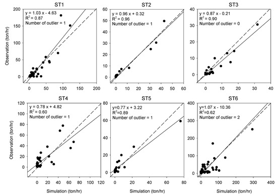 Figure 7. 1:1 scatter plots between observed and simulated suspended sediment loads.