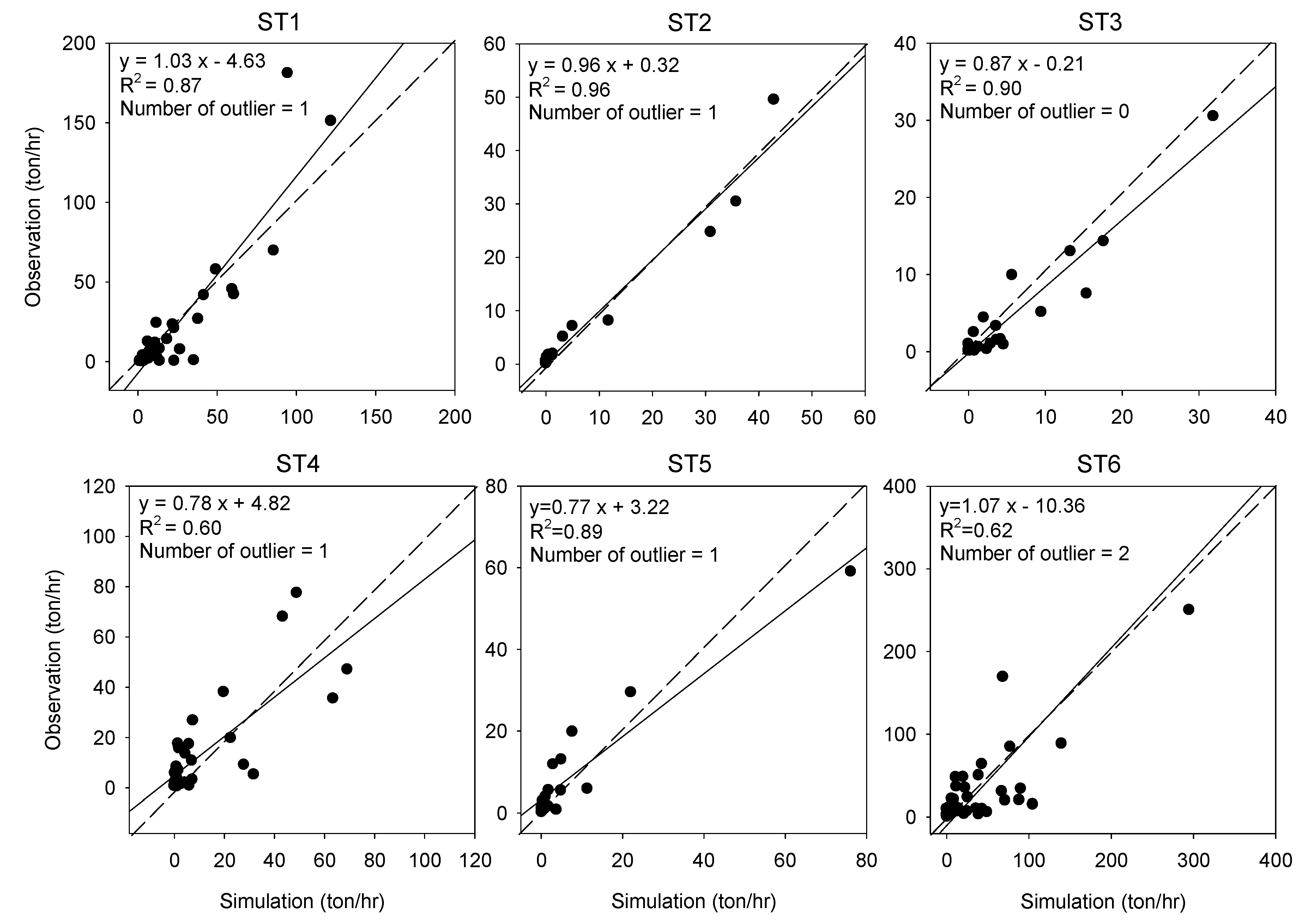 1:1 scatter plots between observed and simulated suspended sediment loads.
