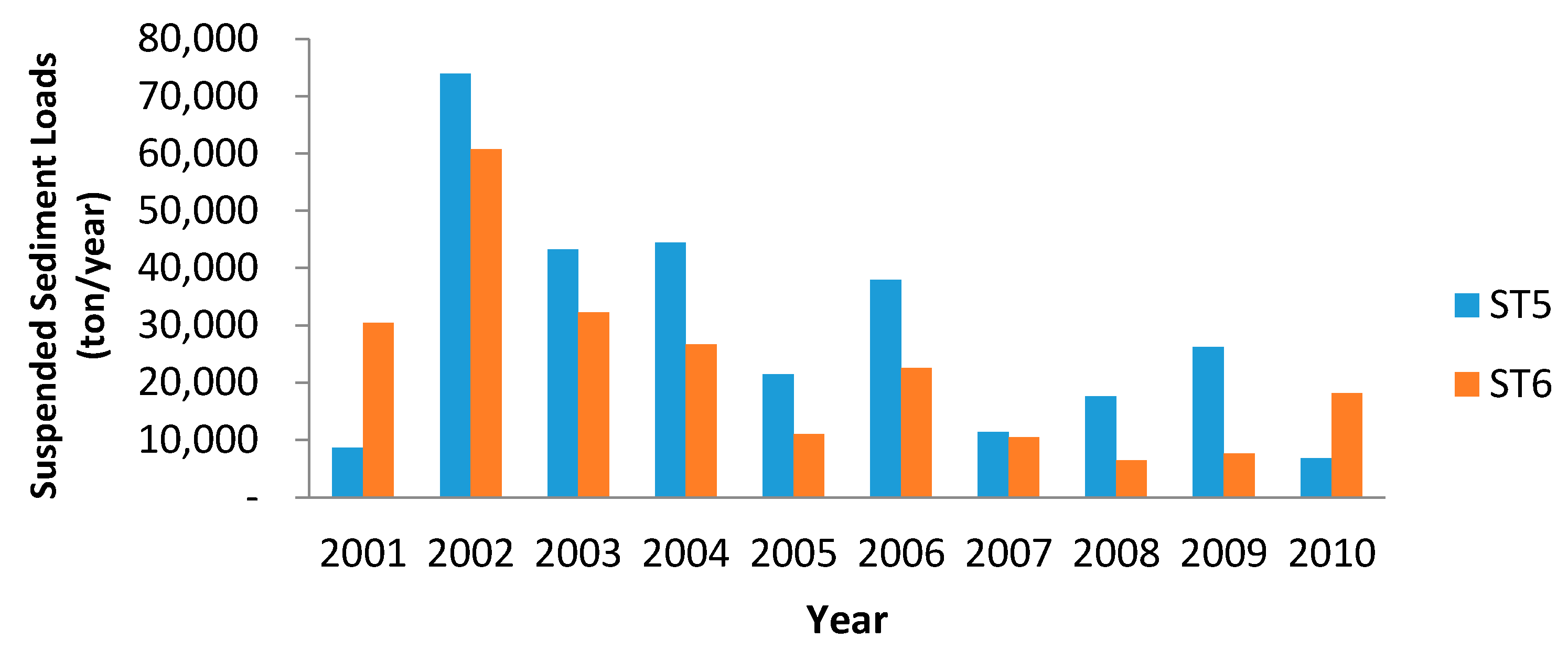 Suspended sediment loads from ST5 and ST6 during 2001 to 2010.