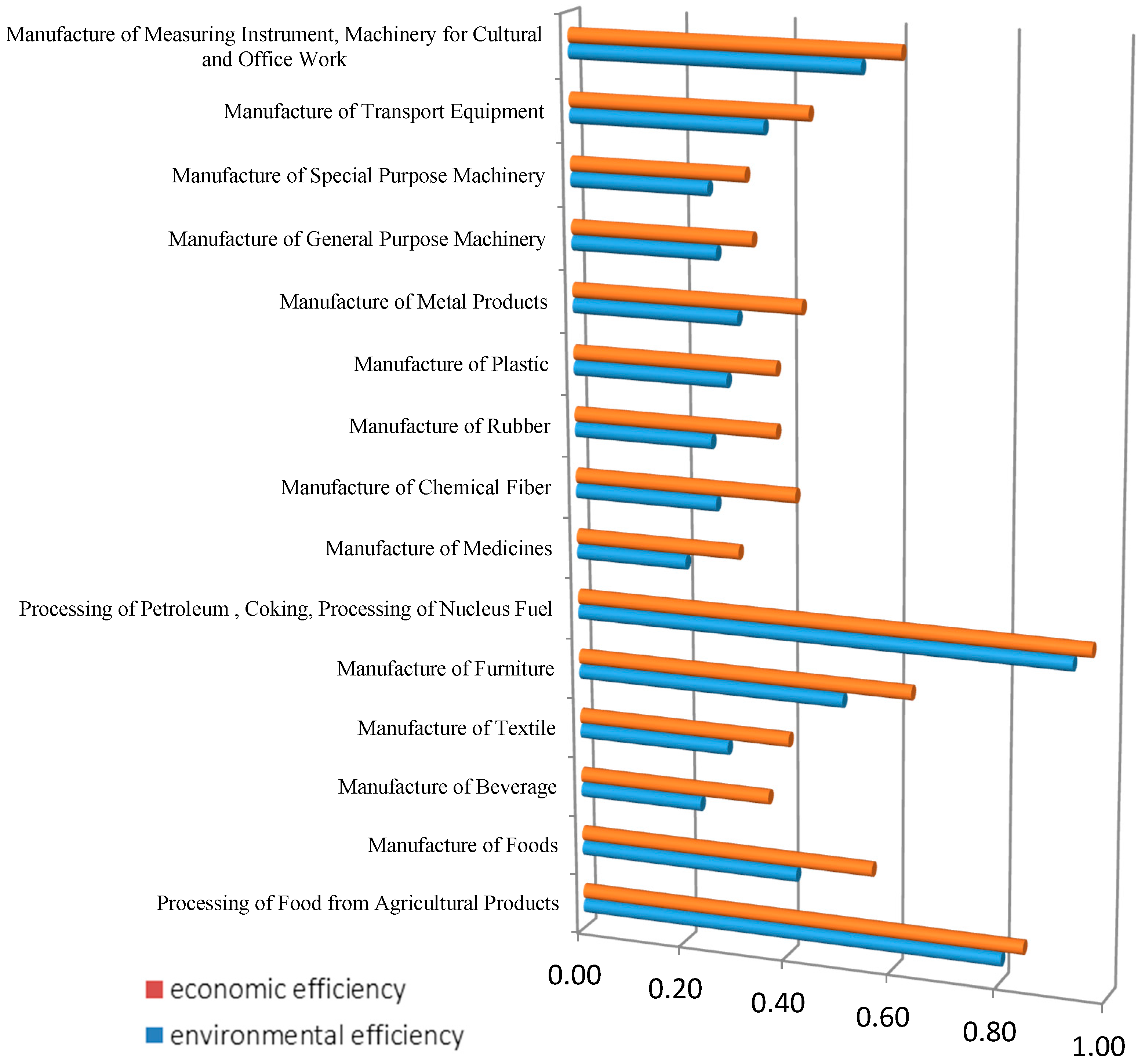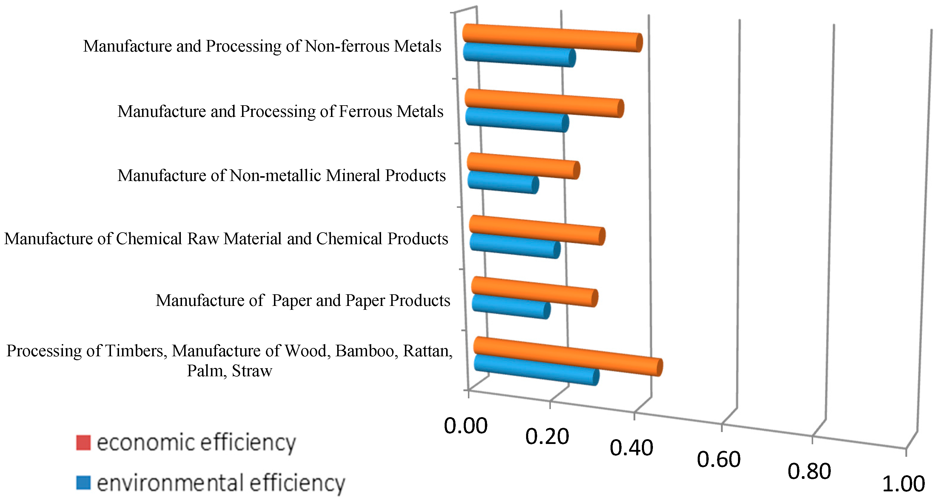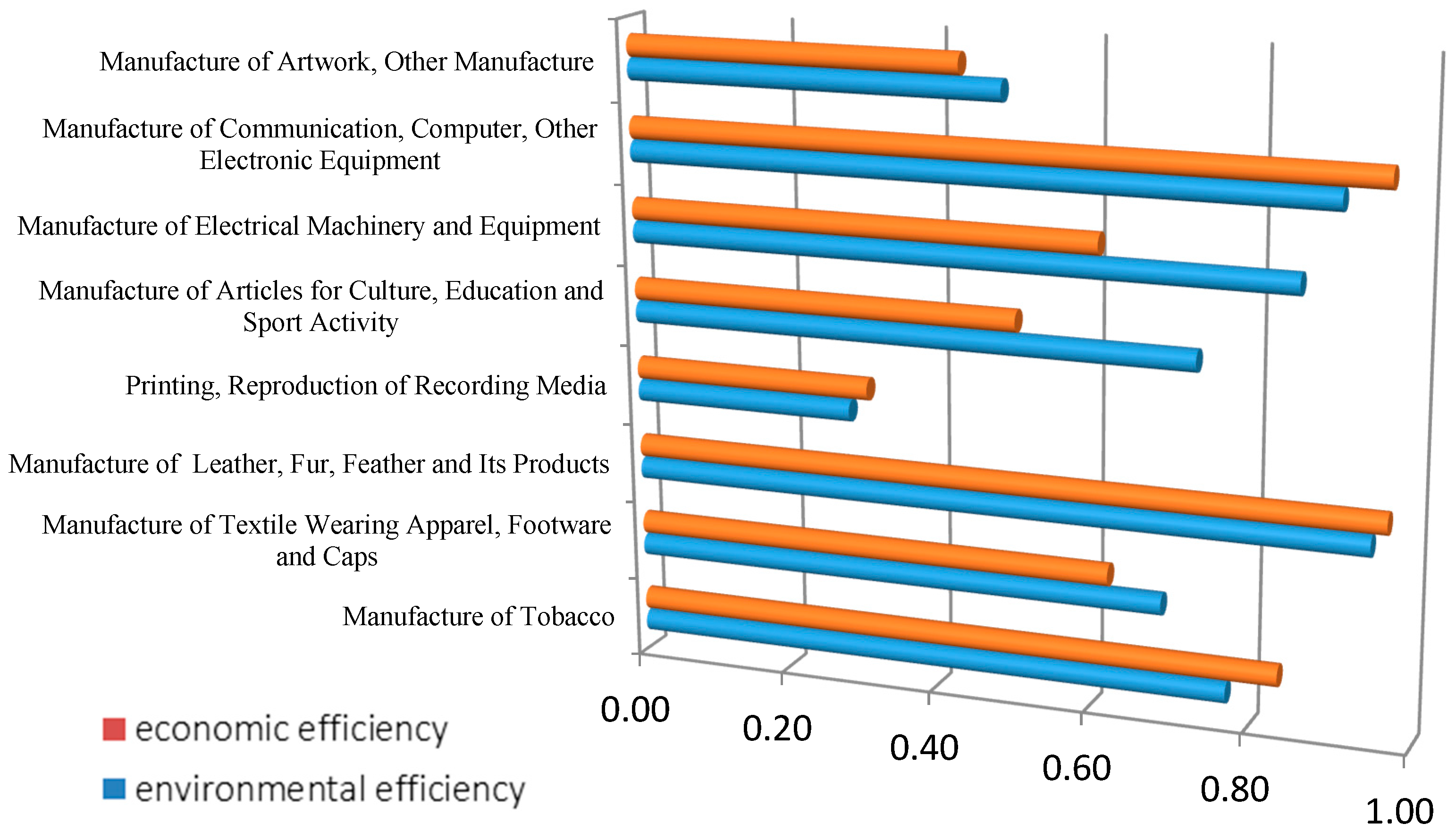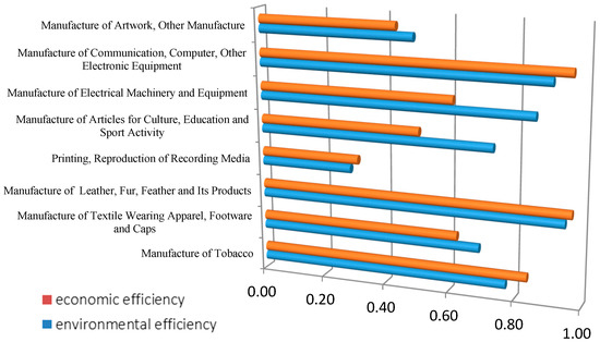 Figure 3 demonstrates the comparison of average efficiency of manufacturing in eight lightly polluted industries from 2006 to 2011. The industries which are classified as lightly polluted industries are mainly composed of high technology industries (i.e., Manufacture of Electrical Machinery and Equipment; Manufacture of Communication, Computer, Other Electronic Equipment and Manufacture of Artwork, Other Manufacture) and clean industries (i.e., Manufacture of Tobacco; Printing, Reproduction of Recording Media and Manufacture of Articles for Culture, Education and Sport Activity). The main characteristics of such industries are less resource consumption and pollutant emission. This classification is basically in accordance with Li and Tao [57]. The efficiency scores of most lightly polluted industries are generally high. Only the efficiency of Printing, Reproduction of Recording Media industry is rather low, which implies its production characteristics bring about serious environmental problem and its environmental condition needs to be improved. Additionally, Figure 3 shows that different from heavily polluted and moderately polluted industries, more than half of the lightly polluted industries’ environmental efficiency scores are higher than the economic ones which implies these industries’ environmental conditions have been greatly improved during the production process. Thus, the environmental and the economic condition of these industries can coordinate well.