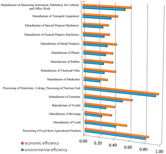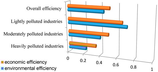 However, from Table 3 and Table 4, we still cannot analyze the difference between environmental efficiency and economic efficiency of heavily polluted, moderately polluted, and lightly polluted industries. Thus, we will make a comparative study on different industries according to classification by pollution intensity. First, the heavily polluted industries are analyzed as follows: