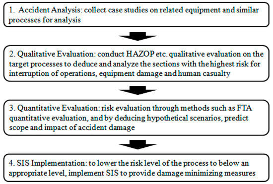 Recently, domestic chemical plants have attempted to minimize the damage of accidents by quantitative risk assessment. The Korea Occupational Safety and Health Agency (KOSHA) has already established and distributed the technical guidelines to minimize the damage at chemical plants []. However, most field sites have not carried out the effective safety measures because of inadequate understanding of quantitative risk assessment with the leakage scenario. In this regard, this study performs the hazard and operability assessment (HAZOP) of the methanol separation process, a highly hazardous process in the bisphenol A (BPA) plant, to evaluate the risk factors []. It is then followed by a quantitative analysis and accident damage prediction fault tree analysis (FTA) is used for processes with potential risks. Based on these analyses, the safety improvement execution steps shown in Figure 1 are presented to determine the necessity of the safety systems.