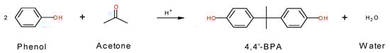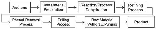 The supplied raw acetone is sent to the acetone vessel and mixed with the recycled acetone. The acetone mixture is sent to D-1101 shown in Figure 4 for methanol removal and acetone refinement. Methanol must be removed before being added to the reactor. Methanol decreases the reactivity of the catalyst and accumulates within the process to decrease the production yield. Methanol also causes corrosion in the operational equipment. The reboiler connected to the bottom of D-1101 provides steam, which evaporates and distills the acetone and methanol mixture in the top part of the column. The refined acetone is released at the bottom of the column, mixed in the pipeline with excess phenol from the recycling phenol vessel, and supplied to the reactor containing a catalyst. Phenol and acetone react in the reactor to create BPA, water, and a small amount of impurities as byproducts, and the main reaction in the reactor is shown in Figure 2, where H+ serves as the cation exchange resin catalyst. The materials released from the reaction are excess phenol, unreacted acetone, and water, which are then sent to the dehydrator to remove impurities. The main chemical equipment is shown in Table 2. Reviewing the operation conditions for all processes in BPA production, the most dangerous process with the highest risk is the methanol separation process because of its highest processing temperature, pressure, and volume.