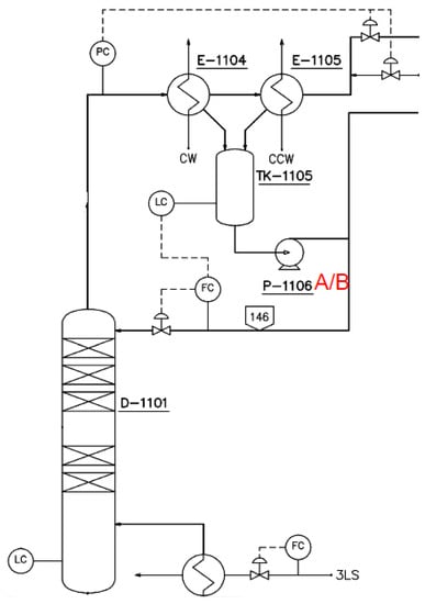 The results of risk evaluation on the methanol separation process showed that the most dangerous potential risks in the methanol separation column can rise from an interruption of power, valve closure due to a malfunction or manual valve control by the operator, and plugging of pipelines []. The most extreme case is a power outage. Since this problem leads to the failure of coolant fed to the vent gas condenser connected to the top part of the methanol separation column, this creates a problem that cannot adequately be taken care of by the capacity of the current flare stack design. As a reactionary measure, if coolant supply is cut off, in which case an increase of pressure in the equipment is predicted, pressure gauges with two-out-of-three voting at the top of the equipment and the function to simultaneously shut the control valve and the emergency shutdown (ESD) valve in the main feed line must be provided.
