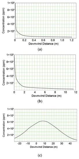 Figure 5 shows the distribution of the mixture concentration with the consideration of wind direction in the cases of the 5-mm pinhole created on the removal column, the fracture of the discharge pipe with a 50-mm diameter, and the catastrophic rupture. From this figure, it is confirmed that the concentration rapidly decreases up to distances of 0.15 m and 2 m from the leakage source in the cases of the pinhole and the fracture of discharge pipe, respectively. However, in the case of catastrophic rupture, the concentration was distributed up to 48 m from the leakage source. The figure also indicates that as the size of the leaking hole decreases, the leakage velocity decreases, and the mixture gas is dispersed into the air as soon as it leaks. Thus, the concentration is distributed in a short distance. On the other hand, as the size of the leaking hole becomes larger, the concentration distributes to a longer distance because of the higher kinetic energy and the leaking velocity of the mixture.