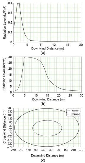 Thermal radiation distributions for the fire accidents from various release sources; (a) pin hole (jet fire); (b) discharge pipe of the safety valve (jet fire); and (c) catastrophic rupture (flash fire).