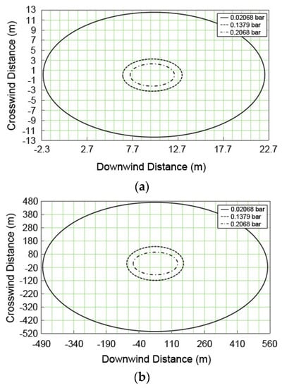 Overpressure distributions for the UVCE accidents from various release sources; (a) discharge pipe of the safety valve; and (b) catastrophic rupture.