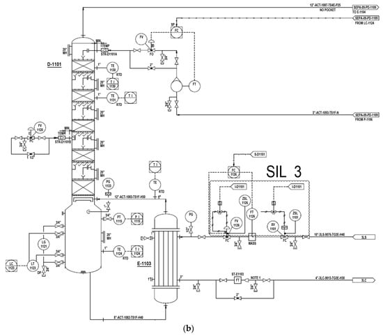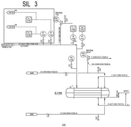 In order to present objective success criteria for application of a target reliability on SIS, an integrity model was implemented. Based on this model, a fault tree analysis (FTA) was conducted in accordance with the KOSHA Code P-4 to quantitatively inspect the failure rate of SIS [,]. The quantification of FTA was performed using KAERI Integrated Reliability Analysis Code Package (KIRAP) developed by Korea Atomic Energy Research Institute (KAERI) []. By providing the generic failure data for each component in the cut set, the program calculated the average PFD for the failure case of systems of interest. Some of the calculations using KIRAP are shown in Appendix A and Appendix B. Finally, SIS was examined to determine whether such system would meet the target SIL. To derive conservative results, the possibility of error recovery by an operator was not included, and only the integrity of SIS itself was considered. To derive a quantitative probability for the qualitatively evaluated worst-case scenario, this research performed a deductive analysis on the causes of specific accidents while including equipment defects and worker’s fault in the analysis. The piping and instrument diagram containing SIS with SIL 3 is shown in Figure 8.