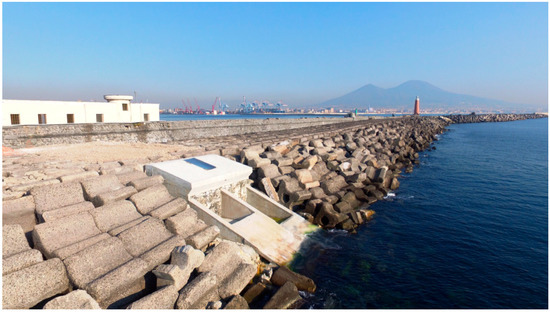 The Overtopping BReakwater for Energy Conversion (OBREC) full-scale prototype at Naples harbour represents the world’s first overtopping wave energy converter totally integrated into an existing breakwater [26]. The prototype has been installed replacing part of the rubble mound armour layer with a front reservoir designed with the aim of capturing the overtopping waves in order to produce electricity (Figure 1). A specially designed concrete structure, consisting of a sloping impermeable front ramp, leads the overtopping waves into a reservoir located immediately behind it. Energy is extracted via low head turbines, using the difference in water levels between the reservoir and the mean sea water level. The total cost of the prototype was covered by the European Structural Funds of the National Operational Programme for “Research and Competitiveness” 2007–2013, by the Italian Ministry of Education, University and Research (MIUR).
