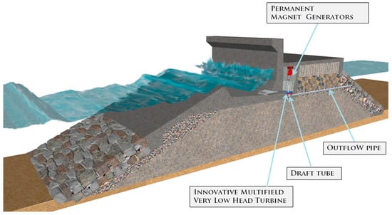 Moving from experience on Sea-wave Slot-cone Generator [4,7,8,46,47], an innovative built integrated device called the OBREC [9] has been developed by the Research team from Second University of Naples. The peculiarities of the OBREC are the easier and less expensive operation and maintenance activities. In fact, it is built as a robust concrete structure with the turbine shaft and the gates controlling the water flow as virtually the only moving part in the mechanical system and the structure is safe even with malfunctioning of these moving parts (Figure 2). Further, thanks to the sharing of the infrastructures and their construction costs (for the function of coastal defence), they tend to be more economically viable than offshore floating WECs, such as Wave Dragon [2] and WaveCat [3].