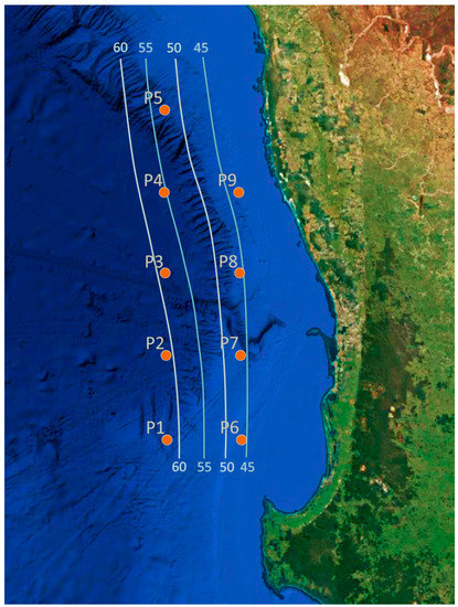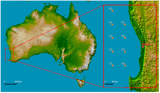 The offshore analysis is carried out using the hindcast wave data provided by the European Centre for Medium-Range Weather Forecasts (ECMWF) [57]. The dataset used is a global atmospheric reanalysis from 1979 termed ERA-Interim. The ECMWF internal WAve Model (WAM) covers the Indian Ocean by a base model grid with a resolution of 0.75° × 0.75°. Nine ECMWF grid points (P1–P9), covering a latitude from 30°S to 33°S with a longitude ranging between 114°E to 114.75°E, have been selected to characterize the offshore energetic patterns (Figure 4). Geographical information of ECMWF grid points are reported in Table 2. The WAM provides 6-h values of significant wave height (Hs), mean wave period (Tm) and mean wave direction (θm). From a 6-h triple (Hs, Tm, θm) dataset, ranging from January 2005 to December 2014, the average wave power has been computed for P1–P9. Operatively, the approximate deep water expression for the wave energy flux, P, has been applied
