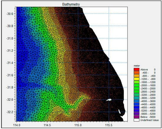 The nearshore wave energy patterns have been determined applying the MIKE 21 SW model for wave propagation in nearshore regions. The model used is MIKE 21 SW, developed by DHI (Danish Hydraulic Institute) Water and Environment. The basic equations in the model are derived from the conservation equation for the spectral wave action density, based on the approach proposed by the authors of [59]. The computational domain was discretized using an unstructured grid with meshes based on linear triangular elements (Figure 5). The domain boundary was chosen to coincide with a polyline passing through five ECMWF points: P1, P2, P3, P4 and P5. The seabed was performed by interpolating at the grid nodes the information provided by the General Bathymetric Chart of the Oceans (GEBCO) database [60] (Figure 5). The grid resolution has been assumed to be variable linearly between 1000 m to 150 m for the depth in the range 500 m to 100 m. Constant values of 150 m and 1000 m of the grid resolution have been assumed respectively for water depth shallower than 100 m and deeper than 500 m respectively. Although the latest release of the 30 arc-second global bathymetric grid has been used, the GEBCO database could not be of good attainability in very shallow water. Hence, the offshore dataset of waves has been propagated to depths of 20 m, as representative of the nearshore wave power. The 20 m-isobath seems very significant considering that several moored and founded WECs installations could be installed at that depth [61,62].