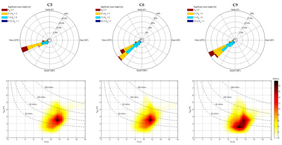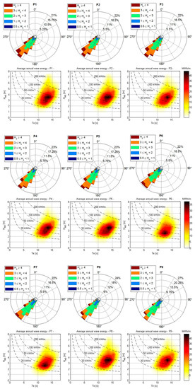 where is the sea water density, g is the gravity acceleration, is the wave height computed on the zero-order moment of spectral function and Te is the wave energy period. Following a conservative approach, according to [58], the energy period has been assumed as 1.14 Tm.