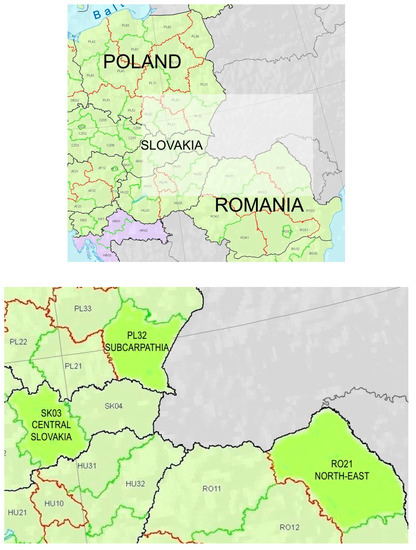 The location of Central Slovakia (SK03), Subcarpathia (PL32) and North-East (RO21) regions. Source: [7], with changes.