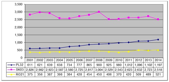 Number of overnight stays in the PL32, SK03, and RO21 regions (2001–2014). Source: own elaboration based on the data from [7].