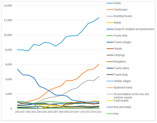 The evolution of the number of accommodation places in the North-East region, based on types of accommodation units (2000–2015). Source: own elaboration based on the data from [14].