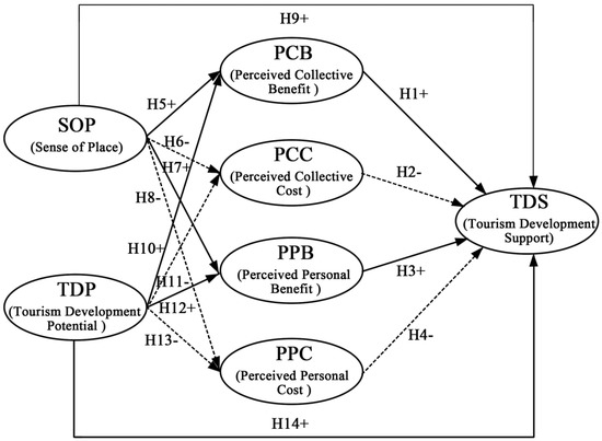 According to cognitive theory, different individuals have different understandings of the current situation, which leads to different behaviors [62]. In terms of residents, their perception of sustainable tourism development potential in their particular place is crucial for their attitude and behavior. Tourism development potential (TDP) describes the tourism developing foundations and is an assessment to predict tourism development. Tourism development potential has something in common with place image, which is the individual’s perception of the specific attributes of a particular place [63]. Both are influenced by environmental psychology, geography, and place and product marketing [43]. Conceptually, tourism development potential is a comprehensive analysis of the destination, for the purpose of tourism development and based on the place image. Limited attention has been given to residents’ assessments of tourism development potential, especially in relation to its effect on residents’ perception of tourism impacts and tourism development support. Past studies paid more attention to specialists’ or scholars’ perceptions of tourism development, and explored a number of “indicators” surrounding tourism developments, which could influence tourism development sustainably and successfully. Melian-Gonzalez focused specifically on natural resources and attractions; there, tourism resources would include certain natural resources (such as beaches, mountains, and countryside), cultural assets (such as museums, traditions, and festivals), and skilled manpower [64]. Wilson suggested ten factors that are most important for successful tourism development including a complete tourism package, good community leadership, support and participation of local government, sufficient funds for tourism development, strategic planning, and so on [65]. González-Ramiro assessed the potential of rural tourism using a method combining with geographic information systems (GIS) software and the analytical hierarchical process (AHP), by some indices including accommodation offer, activities, natural environments, and so on [66]. Mazanec defined and measured the competitiveness of a tourism destination based on heritage and culture, infrastructure, communication facilities, social competitiveness, environmental preservation, tourism price, openness, and education [67]. Stylidis provided empirical evidence indicating that residents’ place image had direct positive effects on their perceived tourism impacts and had indirect positive effects on tourism support [43]. Other studies have also suggested that positive images held by residents indirectly display their support for tourism [68,69]. With the aim of providing a deeper theoretical and practical understanding of the role of residents’ perceptions of sustainable tourism development potential in shaping their support, the tourism support construct is examined as the ultimate dependent variable, and hypotheses are proposed as follows: