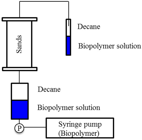 Figure 4 shows the experimental setup for biopolymer-decane displacement in oil-contaminated soils remediation tests. The wetting method was employed to prepare for the decane-saturated sands. One fifth of the soil chamber (inner diameter, ID, = 6.0 cm and height = 18.0 cm) was filled with decane, and dry sand was placed in the decane. This process was repeated five times to prepare for decane-saturated sand. The initial porosity of the sample was 0.381, which was applied to all tests. A small tubing chamber was placed between the transparent soil chamber and the syringe pump, which was filled with biopolymer (PEO and SA) solution and decane. Decane was always placed at the upper layer in the tubing chamber, as its density is lower than the density of the biopolymer solution. Although the syringe pump maintained constant flow rates of 10, 100, 200, 500, and 1000 mL/min, decane was injected into decane-saturated sand, and biopolymer solution was displaced with decane in the soil chamber. Injection of biopolymer solution was continued until biopolymer solution had percolated the decane-saturated sand. An additional twenty pore volumes (PV) of biopolymer solution were eventually injected into the decane-saturated sand after the biopolymer solution had percolated through the sand. Another small tubing chamber was connected to the outlet of the soil chamber, which recorded the amount of both biopolymer solution and decane that flowed out of the soil chamber and was used to estimate the biopolymer solution-decane displacement ratio. A constant room temperature of 24 °C was maintained.