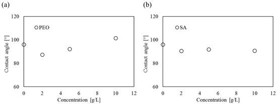 Contact angle variations according to the concentration changes of biopolymer solution: (a) PEO and (b) SA.