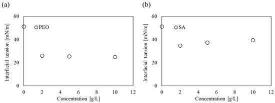 PEO-biopolymer solution interfacial tension variations according to the concentration changes of biopolymer solution: (a) PEO and (b) SA.
