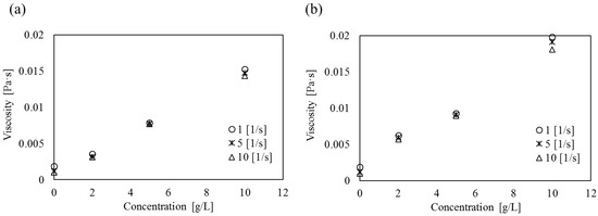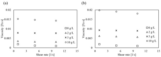 Figure 7 shows the results of the viscosities of the biopolymer (PEO and SA) solutions, with respect to their concentrations for a variety of shear rates (1–10 s−1). The results indicate that (1) the viscosity of PEO and SA is higher than the viscosity of DI water. Compared with other biopolymers in the literature review, the viscosity in this study (1.523 × 10−3~1.867 × 10−3 Pa·s) is higher, at the same concentration (2 g/L) and shear rates (1~10 s−1), than chitosan (7.76 × 10−4~2.415 × 10−3 Pa·s) but is lower than the viscosities of Xanthan gum (0.0665~0.168 Pa·s) and polyacrylic acid (PAA) (0.126~0.408 Pa·s) [8]; (2) the viscosity increases with an increase in the biopolymer solution concentration, within the range of 0–10 g/L (Figure 7); (3) the viscosity decreases with increased shear rates, from 1 s−1 to 10 s−1 (Figure 8), which is consistent with the previous study [7]. Jung et al. (2016) presented that the viscosities of the biopolymer solutions decrease with an increase in the shear rate between 3.4 s−1 and 17 s−1 [7]. At a given biopolymer concentration (0–10 g/L) and shear rate (1–10 s−1), the viscosity change of PEO and SA by the increased concentration of PEO (or SA) is more prominent than the viscosity change of PEO and SA by the decreased shear rate. For example, the viscosity of the PEO solution changed from 0.00185 Pa·s to 0.0153 Pa·s at 1 s−1, with an increased concentration from 0 to 10 g/L. However the viscosity of the PEO solution changed from 1.85 × 10−3 Pa·s to 9.81 × 10−4 Pa·s at 0 g/L concentration with an increase in shear rates from 1 to 10 s−1.