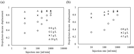 Biopolymer solution-decane displacement according to the increase in injection rate, (a) PEO; (b) SA.