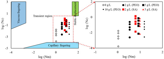 where Nm is the viscous number that is defined as the ratio of the injected fluid viscosity μinv and the defensed fluid viscosity μdef. Nc is the capillary number that represents the ratio of the viscous force over the capillary force, which is associated with the injected fluid velocity vinv, the injected fluid viscosity μinv, the contact angle θ, and the interfacial tension σ. These two dimensionless numbers (Nm and Nc) govern three dominant regions with distinct invasion patterns and efficiencies (Figure 10); capillary fingering, viscous fingering, and stable displacement [57,58]. Figure 10 shows three dominant regions with Nm and Nc values for each test in this study; these values are calculated according to Equations (1) and (2), respectively. The biopolymer solution injecting velocity vinv is calculated as the injection flow velocity divided by the average cross-sectional pore area of the sample, which is calculated as the pore volume divided by the length of the sample. For example, the injection rate of 100 mL/min corresponds to the injection velocity of 9.28 cm/min. Figure 10 also includes the Nm and Nc values in our experiments, which are located in the transition region among the invading patterns represented by Lenormand [55]. The shape and colour of the data are equivalent to the concentration of PEO or SA in Figure 10, which cause the variation in Nc at the constant Nm, due to the change in injection rate. Within this region, the biopolymer solution-decane displacement ratio clearly increases with Nc (Figure 11). However distinct relations between the displacement ratio and Nm were not observed. This finding is conceptually consistent with the previous pore network simulation results [59] and previous experimental studies [8]. Thus an increase in the Nc value is required to increase the biopolymer-decane displacement ratio. As Nc is proportional to the injecting velocity vinv, the injected biopolymer viscosity μinv, and the contact angle on the mineral surface θ, but inversely proportional to the interfacial tension σ (Equation (2)), the following recommendations may increase the biopolymer-decane displacement ratio; (1) increase the biopolymer injection velocity, and (2) increase the biopolymer solution viscosity with a high concentration of biopolymer solutions.